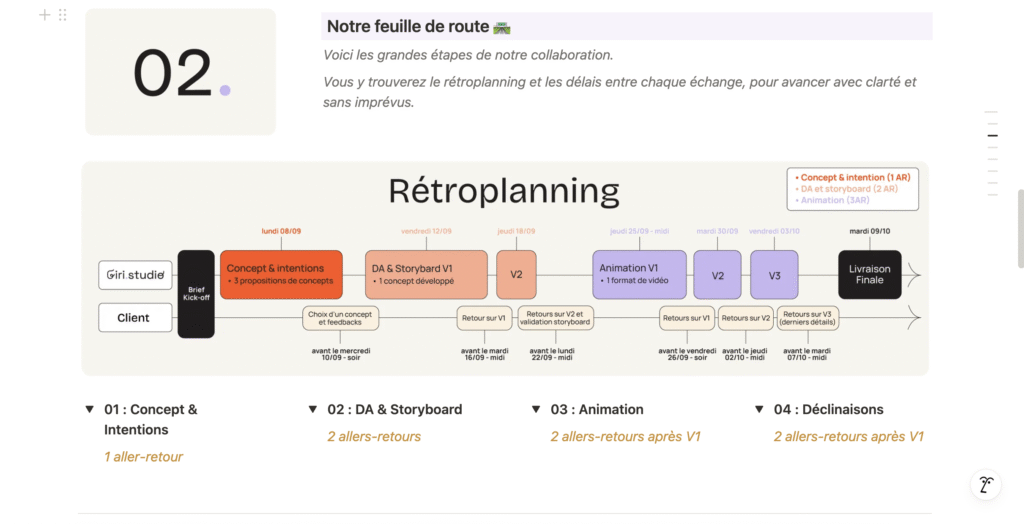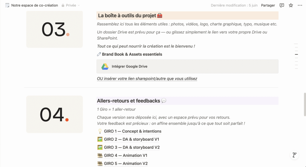 Vous êtes invité à donner vos feedbacks, et à faire évoluer le projet. Grâce à des outils collaboratifs comme Notion, Drive, Frame ou Miro, chaque idée et chaque révision sont centralisées.
